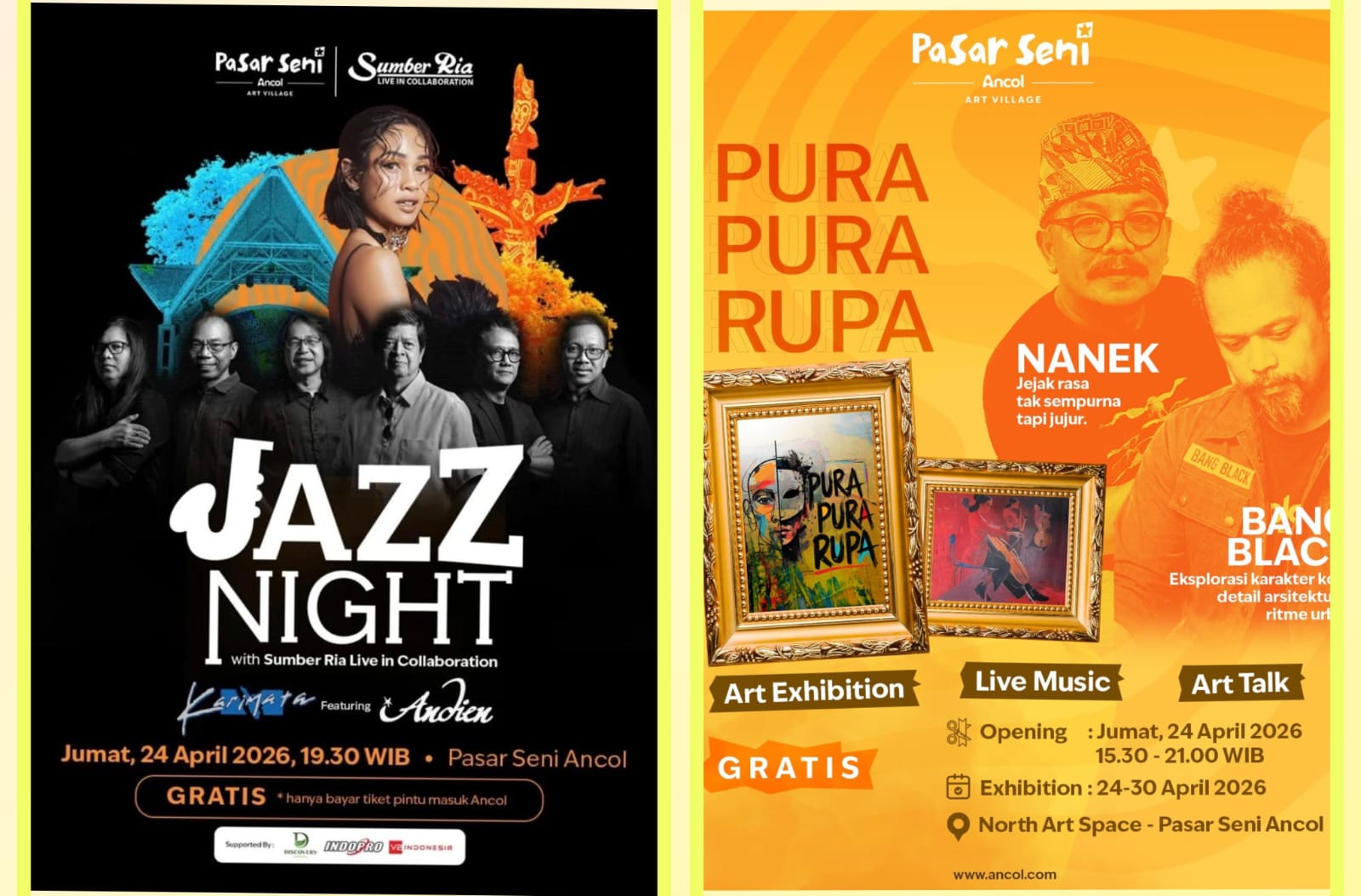 Targetnews.co.id// Jakarta, 24 April 2026 PT Pembangunan Jaya Ancol Tbk melalui Pasar Seni Ancol kembali menghadirkan rangkaian kegiatan seni dan budaya sebagai bagian dari komitmen menghadirkan ruang kreatif bagi masyarakat. Dalam momentum memperingati International Jazz Day, Pasar Seni Ancol menggelar dua event spesial bertajuk “Jazz Night with Sumber Ria Live in Collaboration featuring Andien” dan “Pura Pura Rupa” Art Exhibition pada Jumat, 24 April 2026.